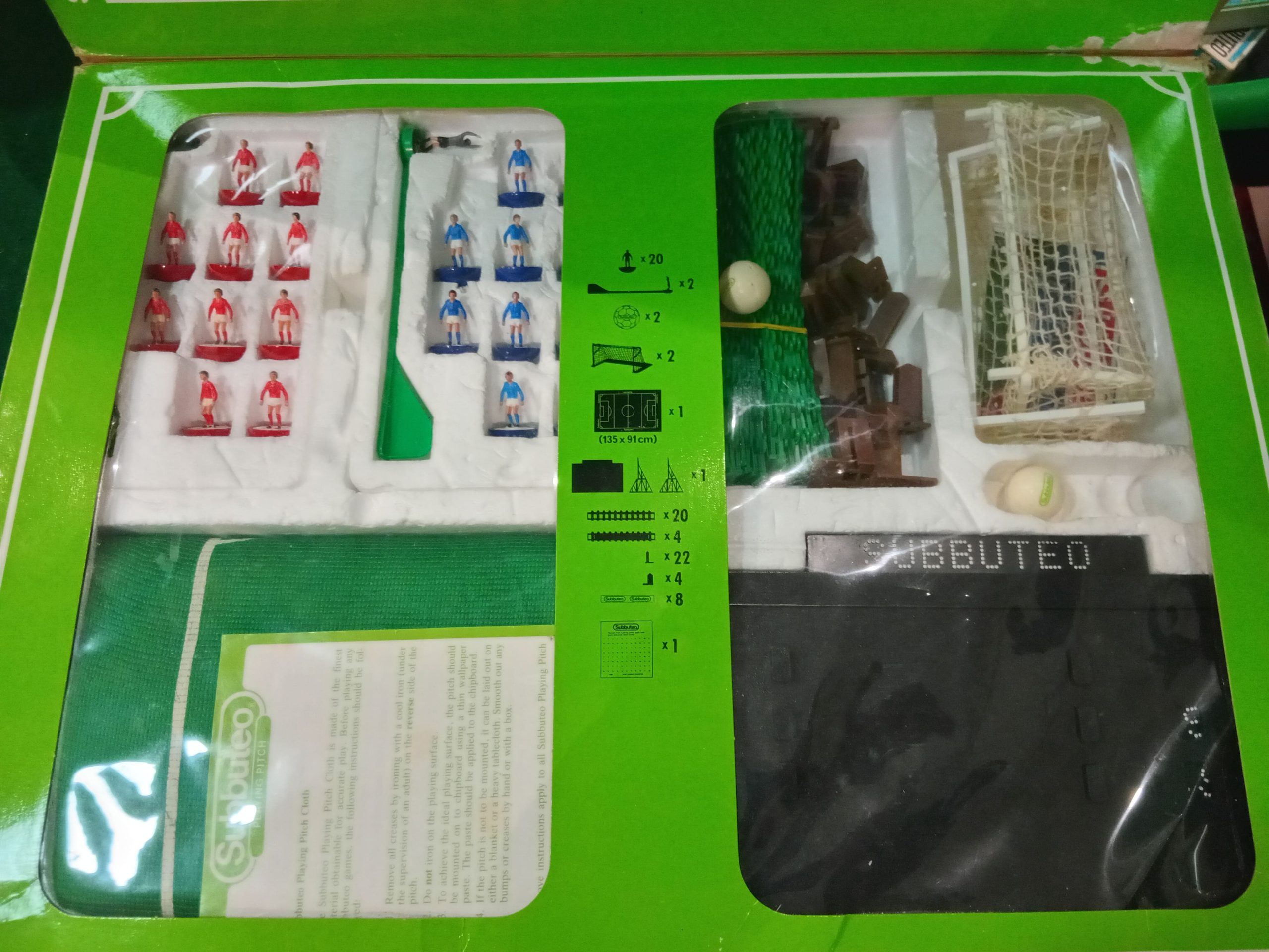 Set in buone condizioni come da foto, composta da due squadre lw con 10 miniature e portiere, coppia porte, palloni campo da gioco, recinsione bordo campo e tabellone segnapunti.